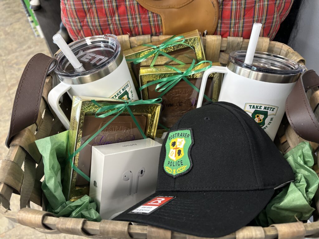 Two Rostraver Police Drug Free Yeti Straw Cups, Gene Boots milk chocolate, Apple Airpods and a Rostraver Police ball cap